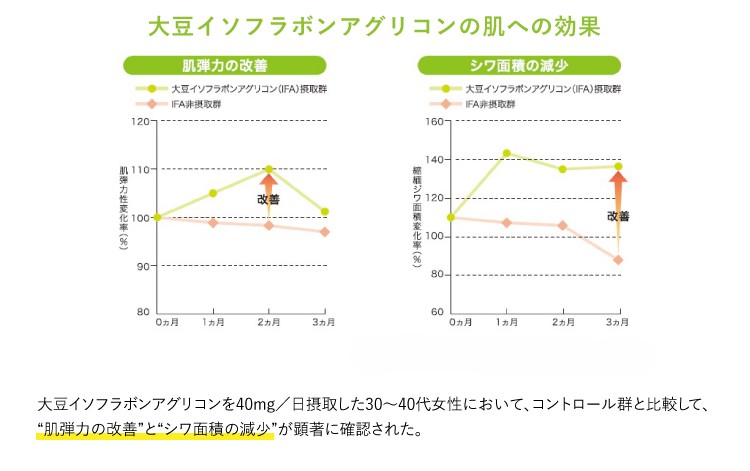 30〜40代の女性を対象にした臨床試験の結果、40mg/日の大豆イソフラボンアグリコンを継続的に摂取してもらったところ、2カ月経過後に肌の弾力が改善し、3カ月経過後にはシワ面積が非摂取群と比較して大きく改善されました。