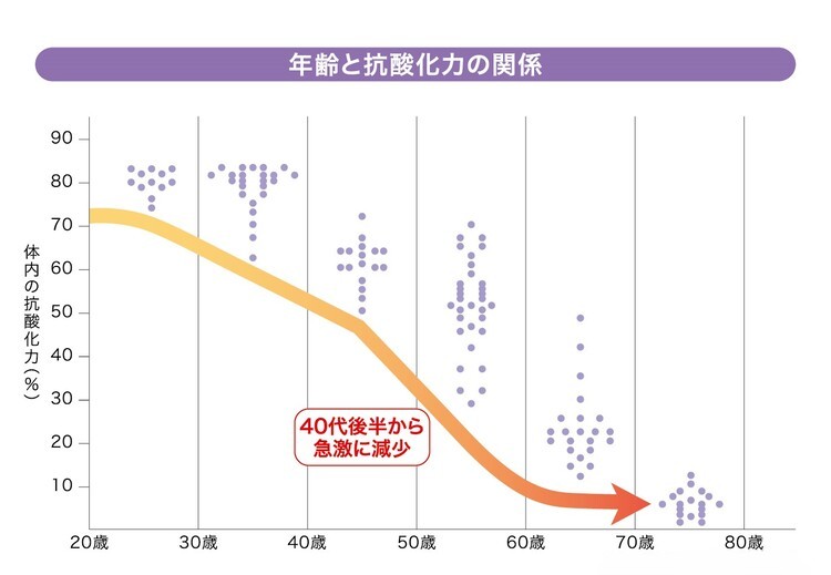 発生した活性酸素は体内に存在するいくつかの酵素で分解されますが、加齢に伴って、この酵素の発現率は低下してきます。特に40歳を境に、いわゆる“体内の抗酸化力”は低下していくことになるのです。