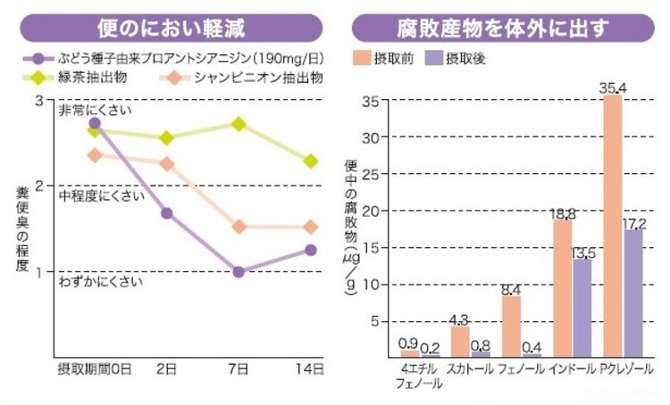 ブドウ種子由来プロアントシアニジンを1日190mg、2週間摂取し続けると、便の中のインドールやクレゾール、スカトールなどの臭気成分の量が減少することで便臭が軽減されることが分かりました。