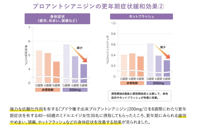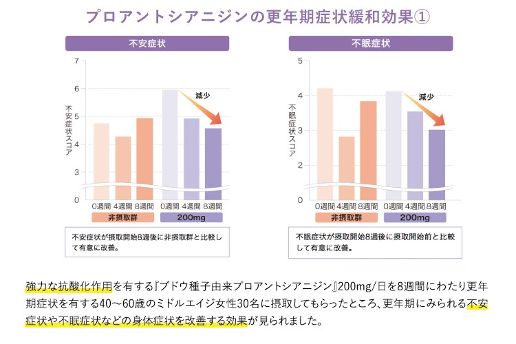 40~60歳の女性を対象にした臨床試験で、ブドウ種子由来プロアントシアニジンを毎日200mg摂取した結果、不安症状が摂取開始8週間後に非摂取群と比較して有意に改善され、不眠症状についても摂取開始8週間後に摂取開始前と比較して有意な改善が見られました。