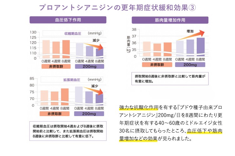 先程の更年期症状緩和効果を評価した同じ臨床試験で、血圧についても評価をした結果、ブドウ種子由来プロアントシアニジン摂取開始4週目で収縮期血圧(上の血圧値)が摂取開始前と比較して、また、摂取開始8週目で収縮期血圧(上の血圧値)と拡張期血圧(下の血圧値)がそれぞれ摂取開始前、非摂取群と比較して有意に低下することが分かりました。