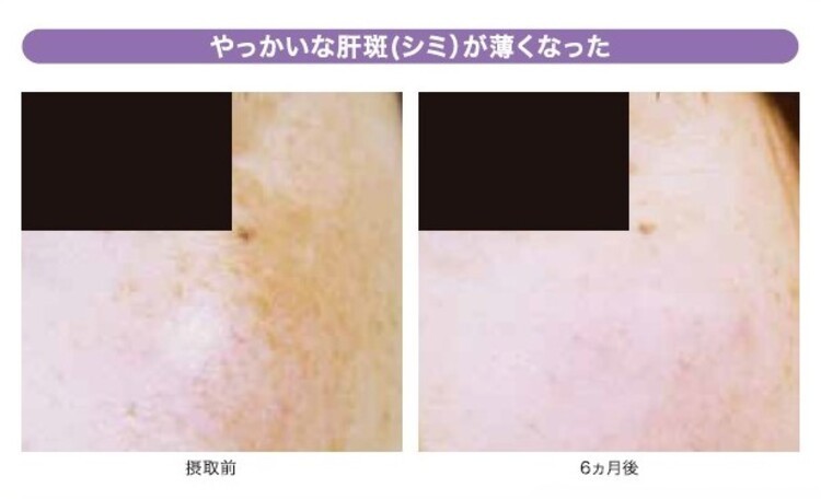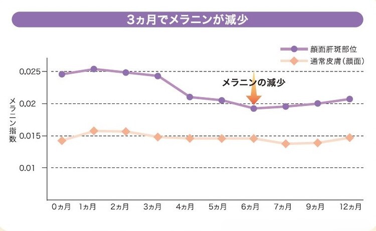 中でも、この試験に参加した34歳の女性(試験参加当時)は、飲み始めて6カ月後に写真のように明らかに肝斑が薄くなりました。春先になって紫外線量が増えた7カ月目からメラニン指数が多少増加しましたが、肝斑が悪化することなく、メラニン指数の上昇もかなり抑制されたことが分かっています。