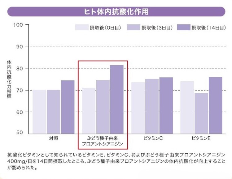 その結果、ブドウ種子由来プロアントシアニジンの抗酸化力は、ビタミンCやビタミンEに比べて高いという結果が出ました。