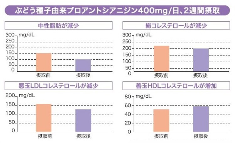 1日400mgのブドウ種子由来プロアントシアニジンを2週間継続摂取した結果、中性脂肪、悪玉コレステロールと呼ばれるLDLコレステロール、および総コレステロール値が減少しました。また、善玉コレステロールであるHDLコレステロールも増加し、脂質代謝全体が改善されました。