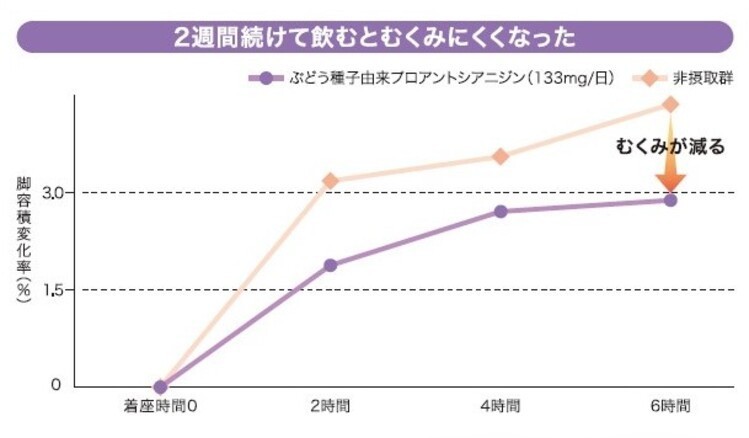 また、脚のむくみについて評価した臨床試験の結果では、ブドウ種子由来プロアントシアニジンを1日133mg、2週間摂取した後にむくみが改善しました。