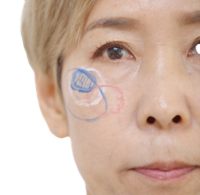 ・頬高さん …頬骨の位置が高い頬高さんの場合、青の部分にチークを入れるとさらに頬高が目立ってしまいます。この部分は避けて、赤丸の部分を中心にしながらふわっと入れると、ふっくらハリが出て可愛い感じになります。ブラシを下から持ち、ぽんぽんと赤丸から周囲に広げるように乗せてみてください。