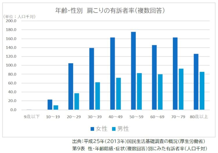 ―肩こりや腰痛は、幅広い年齢層で自覚されているのですね。肩こりを訴える女性は、40代50代は、男性の2倍近くもいますね。