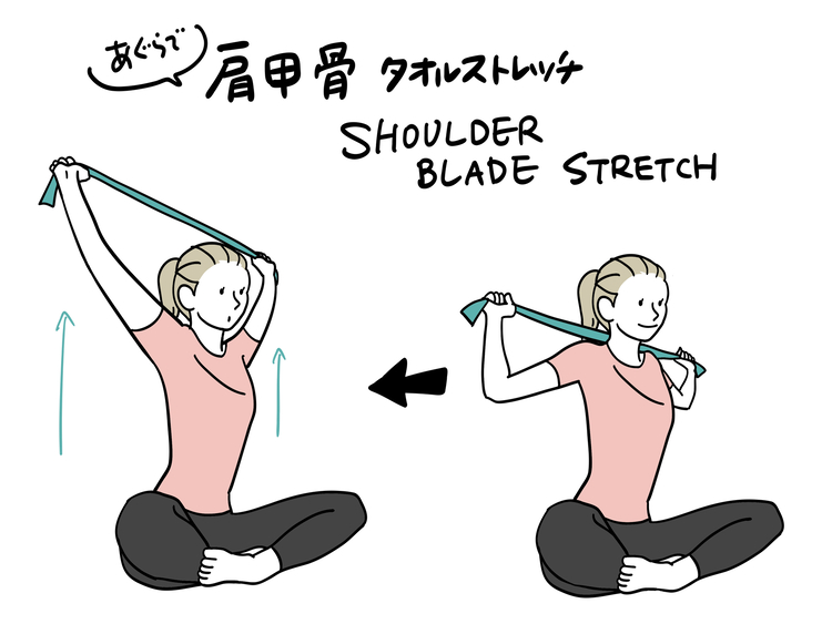 例えば、タオルの端を持ち、そのまま頭の上に腕をゆっくり上げて胸を広げ、ゆっくりと頭の後ろに下ろすストレッチは、肩と肩甲骨の柔軟性を高めるのに役立ちます。